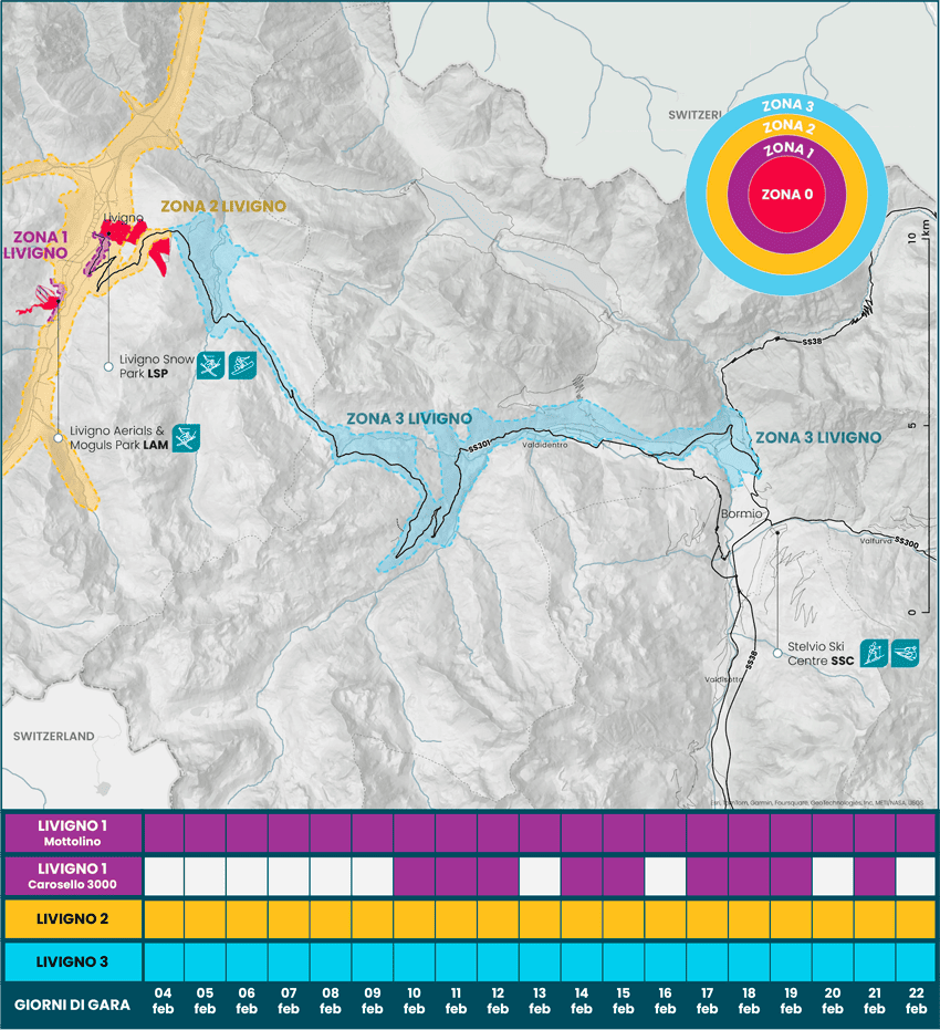The entire built-up area of Livigno will be included in LIVIGNO Zone 2, with additional Zone 1 areas activated near the two competition venues: Livigno Aerials & Moguls (Carosello 3000) and Livigno Snow Park (Mottolino).